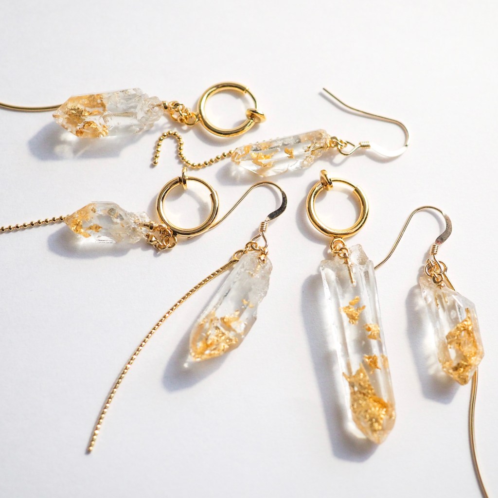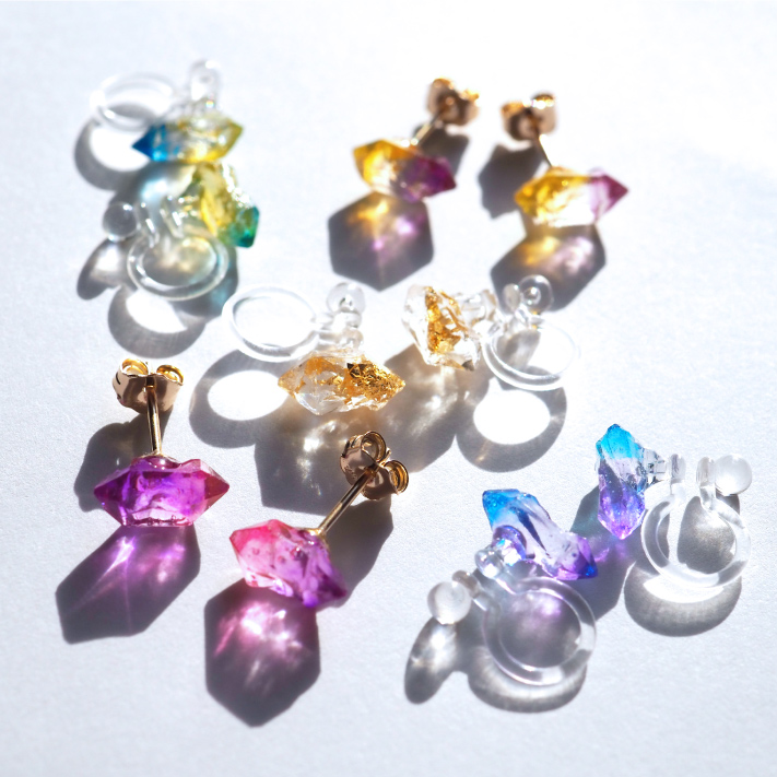 Accessories Gallery 本物の水晶を型取りし、着色した樹脂で制作したオリジナルパーツを使用しています。自然が生み出した美しい形と、やさしい煌き。自由な色の組み合わせや軽さで、本物の水晶にはない楽しさを味わうアクセサリーです。 現在休止中。 出店情報はこちら WebShopはこちら
